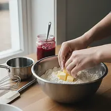 Add cold butter cut into small cubes (about 1x1 cm). Using your fingertips, quickly rub the butter into the flour until fine crumbs resembling wet sand or semolina form. The goal is to warm the butter as little as possible with your hands. You can also use a pastry cutter or food processor (a few pulse movements).