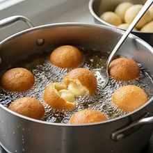 In a wide pot or deep skillet, heat the oil to a temperature of 175-180°C. If you don't have a thermometer, drop in a piece of dough - it should immediately float to the surface and start to brown surrounded by small bubbles. If it smokes, it's too hot, and if it sinks to the bottom, it's too cold.