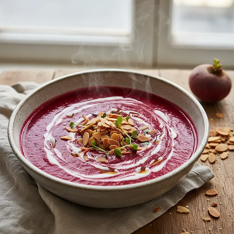 Podawaj zupę w białych, głębokich talerzach, aby podkreślić jej intensywny, rubinowy kolor. Dla dodatkowej elegancji, oprócz migdałów i tymianku, możesz skropić powierzchnię zupy kilkoma kroplami wysokiej jakości oliwy truflowej. Zupa doskonale komponuje się z wytrawnym, czerwonym winem.