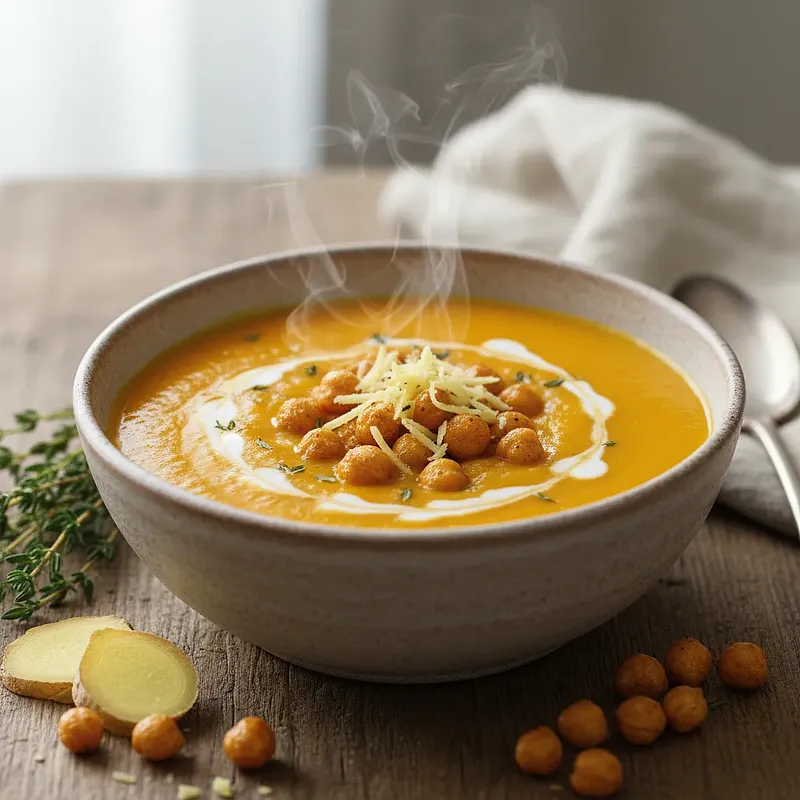 Ten przepis to kwintesencja jesieni zamknięta w misce. Aksamitny, gęsty krem z pieczonej dyni Hokkaido i słodkiej marchewki to danie, które rozgrzewa od środka i zachwyca głębią smaku. Pieczenie warzyw przed zmiksowaniem wydobywa z nich naturalną słodycz i karmelowe nuty, których nie da się osiągnąć przez zwykłe gotowanie. Pikantna nuta świeżego imbiru i czosnku doskonale równoważy słodycz, a dodatek mleczka kokosowego nadaje zupie egzotycznego charakteru i cudownej, kremowej konsystencji. Prawdziwą gwiazdą tego dania jest jednak dodatek – chrupiąca ciecierzyca, upieczona z wędzoną papryką i kminem rzymskim. Stanowi ona fantastyczny kontrast teksturalny dla gładkiej zupy, dodając jej charakteru i sprawiając, że danie jest bardziej sycące. Zupa ma piękny, intensywnie pomarańczowy kolor, który wspaniale prezentuje się na talerzu, zwłaszcza udekorowana kleksem mleczka kokosowego, prażonymi pestkami dyni i świeżą kolendrą. Idealnie sprawdzi się jako elegancka przystawka na przyjęciu, sycący obiad w chłodny dzień lub lekka, ale pożywna kolacja.
