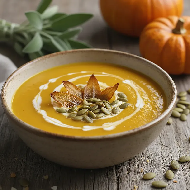 Gorącą zupę wlej do głębokich miseczek lub talerzy. Na wierzchu każdej porcji ułóż po kilka chrupiących listków szałwii. Posyp obficie prażonymi pestkami dyni. Możesz dodatkowo skropić zupę odrobiną oliwy z oliwek lub resztką śmietanki, tworząc na powierzchni wzorek. Podawaj natychmiast, póki jest gorąca.