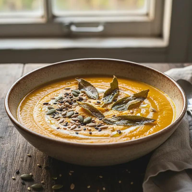 Ten przepis to kwintesencja jesieni zamknięta w misce. Aksamitny, gęsty krem z pieczonej dyni Hokkaido urzeka głębokim, słodkawym smakiem, który jest wynikiem karmelizacji warzyw w piekarniku. Jego intensywny, pomarańczowy kolor pięknie kontrastuje z zielenią chrupiących, aromatycznych chipsów z szałwii i prażonymi pestkami dyni, które dodają całości nie tylko tekstury, ale i orzechowej nuty. Danie jest niezwykle rozgrzewające i sycące, a jednocześnie eleganckie. Idealnie sprawdzi się jako danie główne na lekki obiad, wytworna przystawka podczas uroczystej kolacji lub po prostu jako komfortowe jedzenie na chłodny wieczór. Podawany z kleksem śmietany lub mleczka kokosowego i odrobiną oliwy, staje się małym dziełem sztuki kulinarnej.