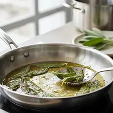 Na tej samej patelni rozgrzej łyżkę oliwy z oliwek. Oderwij listki szałwii od gałązek. Gdy oliwa będzie gorąca, ostrożnie połóż na niej listki szałwii w jednej warstwie. Smaż przez około 30-60 sekund z każdej strony, aż staną się ciemnozielone i chrupiące. Wyjmij je łyżką cedzakową na talerz wyłożony ręcznikiem papierowym, aby odsączyć nadmiar tłuszczu.