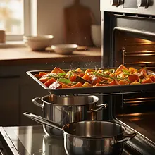 Place the tray with vegetables in the preheated oven. Bake for about 30-40 minutes. Halfway through baking (after about 15-20 minutes), stir the vegetables with a spatula to ensure they brown evenly. The vegetables are ready when the pumpkin and carrot are completely soft (a fork should go in without any resistance), and their edges are slightly browned and caramelized.