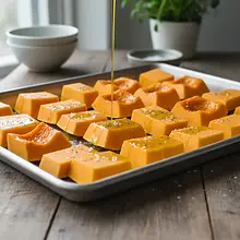 Preheat the oven to 200°C, setting it to 'top-bottom' or 'fan mode'. Prepare a large baking tray and line it with parchment paper to prevent the pumpkin from sticking and to make cleaning easier.
