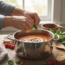 Zdejmij garnek z ognia. Dodaj do zupy porwane liście świeżej bazylii (pozostaw kilka najładniejszych do dekoracji). Używając blendera ręcznego (żyrafy), miksuj zupę bezpośrednio w garnku, aż do uzyskania idealnie gładkiej, aksamitnej konsystencji. Miksuj cierpliwie, wykonując ruchy w górę i w dół, aby napowietrzyć zupę i pozbyć się wszystkich grudek.