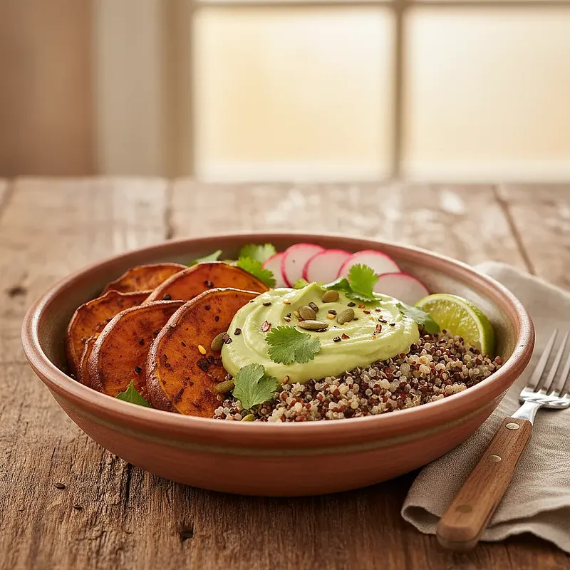 Serve the dish in deep ceramic bowls to emphasize its rustic character. You can place a wedge of lime next to the bowl for additional drizzling over the dish as desired. The dish tastes best when the quinoa and sweet potatoes are warm, and the sauce and toppings are cold, creating an interesting contrast in temperature.