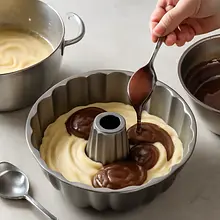 In the prepared bundt pan, layer the ingredients in the following order: 1) 1/3 of the light batter, 2) 1/3 of the chocolate batter, 3) 1/3 of the light batter, 4) the remaining chocolate batter, 5) the remaining light batter. After each layer, gently shake the pan (without pressing too hard) to level the surface. Then take a long knife or stick and draw vertically or spirally a few times through the batter to create a marbled/spiral effect — do not mix too much, just a few turns to achieve clear chocolate streaks.
