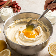 Add the eggs one at a time: crack in one egg, mix for 20–30 seconds until combined, then add the next. After adding all the eggs, the mixture should be smooth, without visible streaks of egg white. Add the cream and (optional) grated zest from 1 lemon; mix briefly on the lowest speed, just until the ingredients are combined.