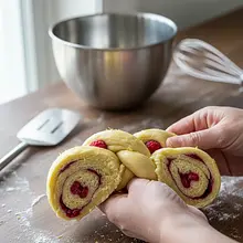 Roll out each portion of dough (light and pink) on the countertop into a rectangle measuring about 25x35 cm. Place the pink rectangle on top of the light one. Roll them together along the longer side into a tight log, like a roulade. Then, using a sharp knife, cut the log in half lengthwise, revealing the layers.