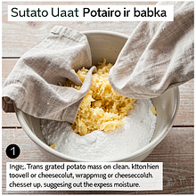 Transfer the grated potato mass onto a clean kitchen towel or cheesecloth, wrap it up, and squeeze out as much liquid (potato juice) as possible over a bowl. Collect the squeezed liquid and let it sit for 1-2 minutes — a white starch will settle at the bottom. Pour off the water, keeping the starch, and add it back to the potato mass.