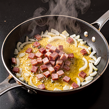 Cut the bacon into small cubes (about 0.5 cm). Heat a pan over medium heat, pour in the canola oil (about 2 tablespoons) and add the bacon. Fry for 6-8 minutes until the fat renders and the pieces become golden and crispy. Add the grated onion and fry for another 3-4 minutes until the onion becomes translucent and slightly caramelized. Finally, add the garlic and fry for 20-30 seconds until you can smell the aroma. Set aside and let it cool slightly.