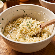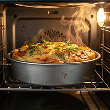 Traditional potato cake with dill is a hearty main dish originating from Polish rural cuisine. Made from raw potatoes, onions, eggs, and a small amount of flour, it has a crispy crust and a moist interior. The addition of fresh dill gives it a spring-like, slightly anise aroma that pairs perfectly with sour cream or crispy bacon bits. The cake works well as a lunch dish with a young cabbage salad or as a warm snack for family gatherings. Visually, it should have a golden, evenly baked surface, distinct layers of grated potato, and green strands of dill in the cross-section.