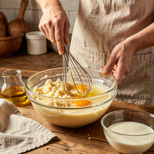 In a bowl with grated apple, add the eggs, rapeseed oil, milk, and (if using) honey. Whisk the ingredients with a fork or a whisk for about 30–60 seconds until the mixture becomes smooth and slightly frothy.