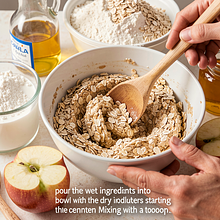 In a separate large bowl, mix the oats, all-purpose flour, brown sugar, baking powder, salt, and cinnamon. Use a fork or spoon to evenly distribute the ingredients.