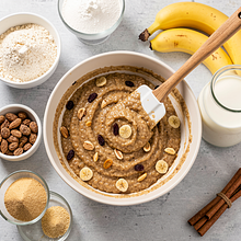Pour the wet mixture into the dry ingredients and add the mashed bananas. Gently mix with a spatula or wooden spoon, making upward motions until most of the dry ingredients are combined — about 20-30 seconds. The batter should be thick, moist, and only slightly sticky. If you are adding raisins and nuts, fold them in evenly at the end.