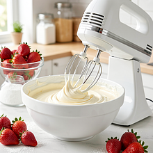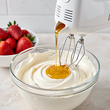 Whip the cream on medium speed for about 2–4 minutes: start slowly, then increase the speed to medium-high. Watch the consistency — after about 2 minutes, soft peaks will form, and after 3–4 minutes, stiffer peaks. The cream is ready when clear but flexible peaks form after lifting the whisk, and the mixture holds its shape.