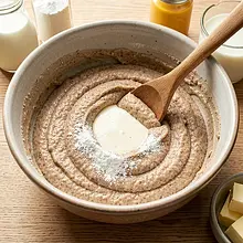Make a well in the center of the dry ingredients and pour in the wet ingredients. Mix with a whisk or spoon from the inside out until there are no dry lumps. The batter should be thicker than pancake batter, with a consistency resembling thick cream — if it is too thick, add 1-2 tablespoons of milk.
