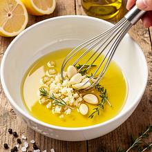 In a large bowl, combine olive oil (60 g), crushed 3 cloves of garlic (15 g) — crush them with the flat side of a knife, then finely chop or press through a garlic press — juice from 1 lemon (squeezing it without seeds), thyme (4 g), 6 g of salt, and freshly ground pepper (2 g). If you want a glaze, add 30 g of honey (optional). Mix with a fork or a small whisk until you achieve a homogeneous emulsion.