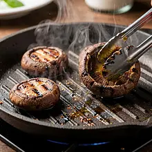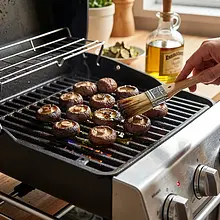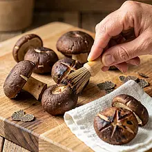 Clean the porcini mushrooms: hold the cap in one hand, gently brush off the dirt and needles with a dry brush or a damp cloth. Do not rinse the mushrooms under running water to avoid soaking them; if they are very dirty, quickly wipe them with a damp paper towel. Cut off the tough ends of the stems — for large mushrooms, trim 1–2 cm. If the caps are very large, cut them in half with a thickness of about 2–3 cm to make grilling easier.