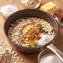 Prepare the crumble: in a small bowl, mix the oats with sugar, cinnamon, and a pinch of salt. Melt the butter in a small pan over medium heat (about 1–2 minutes) until it starts to foam and smell fragrant. Add the melted butter to the oat mixture and vigorously mix with a fork to ensure the oats are evenly coated. The mixture should be slightly moist and crumbly — this is a sign that the crumble is ready.