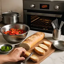 Spread 1–2 tablespoons of the prepared tomato mixture (about 30–40 g per slice) on each toast, distributing it evenly so as not to soak the edges. Then tear fresh basil leaves into smaller pieces and sprinkle them over the bruschettas. Optional: drizzle each bruschetta lightly with the remaining olive oil (if needed) and a thin line of balsamic glaze (about 5 g per slice) and sprinkle with Parmesan flakes (about 5 g per slice). Serve immediately — bruschetta tastes best right after assembly, before the toast softens from the moisture of the tomatoes.