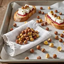 Preheat the oven to 180°C (top-bottom). Spread the hazelnuts on a baking sheet in a single layer. Place in the oven for 8-10 minutes, stirring once halfway through. The nuts are ready when the skin starts to crack and the aroma is intense. After removing, set aside to cool and vigorously rub the nuts with a cloth to remove the loose skin. Then finely chop with your fingers or a knife.