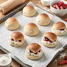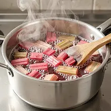 Prepare the rhubarb: wash the stalks, trim the tough ends, and cut into 1–2 cm pieces. Place the rhubarb in a medium saucepan, add 150 g of sugar (from the total amount) and 15 ml of lemon juice. Heat over medium heat, stirring with a wooden spoon every few minutes, until the sugar dissolves and the mixture begins to boil.