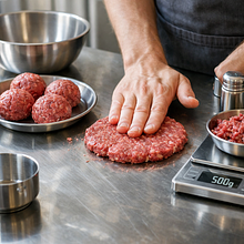 Prepare all the ingredients and tools: kitchen scale, cutting board, sharp knife, large bowl, cast iron or heavy metal skillet (best for searing), small baking tray, hand blender or food processor for the sauce. Measure out the meat, buns, and toppings. Take the meat out of the fridge about 10 minutes before shaping, so it’s not cold.