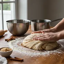 Start by preparing the starter. In a small saucepan, heat 200 ml of milk. It should be slightly warm, like bath water for a baby (about 37°C). Milk that is too hot will kill the yeast. Crumble 25g of fresh yeast into a large bowl or cup, add 1 tablespoon of sugar (about 15g) from the measured portion, and then pour in the warm milk. Gently mix everything with a fork until the yeast dissolves. Cover with a cloth and set aside in a warm, draft-free place for about 10-15 minutes. The starter is ready when a thick, high foam appears on its surface - this is a sign that the yeast is active and working.