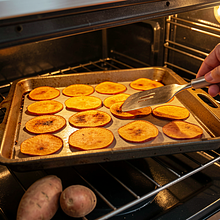Wash the sweet potatoes under running water. Peel them if the skin is thick or dirty; for extra crunch, you can leave the skin on. Using a mandoline, set the blade to 1.5–2 mm and slice into thin, even rounds. If you don't have a mandoline, use a large, sharp knife and cut thin slices while keeping the sweet potato stable on the cutting board.