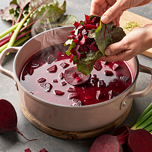Beetroot cold soup is a light, refreshing cold soup originating from Polish cuisine, particularly popular in spring and summer when fresh beet greens are available. It has an intense pink-red color, a mildly sour taste (depending on the kefir and lemon juice used), and fresh herbal notes of dill and green onions. Traditionally, it is served with hard-boiled eggs and young potatoes, making it a nutritious yet light meal. Perfect as a lunch, a quick dinner on warmer days, or an appetizer during family gatherings. Visually, it attracts attention with the contrast of the white egg and green herbs against the creamy-pink soup.