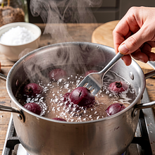 Place the chopped beets in a pot, cover with cold water so that the water covers the beets by about 2 cm. Add a pinch of salt (about 1 g). Bring to a boil over high heat, then reduce the heat to medium and cook for 10–12 minutes, until the beets are tender — you can check this by piercing the largest piece with a fork; the fork should go in easily.