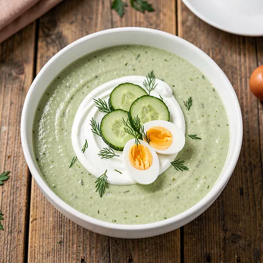 Refreshing cold soup with cucumbers and sorrel is a light, springtime cold soup inspired by the Polish tradition of consuming sour soups in the summer. It combines creamy buttermilk with tangy sorrel and fresh cucumber, creating a green, vibrant flavor with hints of lemon and dill. Serve chilled as an appetizer or a light lunch with young potatoes, whole grain bread, or hard-boiled eggs. The dish is quick to prepare, visually striking (intense green color with bright accents), and full of spring aromas.