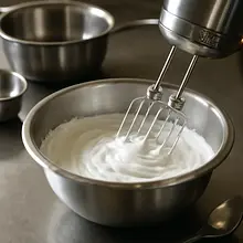 Whip the cream: pour well-chilled heavy cream (400 g) into a chilled bowl and beat with a mixer on medium speed for the first 1–2 minutes, then increase the speed until soft peaks form (about 3–4 minutes). Towards the end of whipping, add 40 g of powdered sugar and a pinch of salt, and whip for another 30–40 seconds until stiff but velvety peaks are achieved.