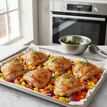 Preheat the oven to 200°C (fan) or 220°C (top-bottom). Line a large baking tray with parchment paper. Evenly spread all the prepared vegetables on it, creating a single layer. On top of the vegetables, place the marinated chicken thighs, skin side up, leaving small gaps between them. Put the tray in the preheated oven and bake for about 40-45 minutes. After 30 minutes, check the degree of doneness - if the vegetables at the edges are browning too quickly, gently stir them.
