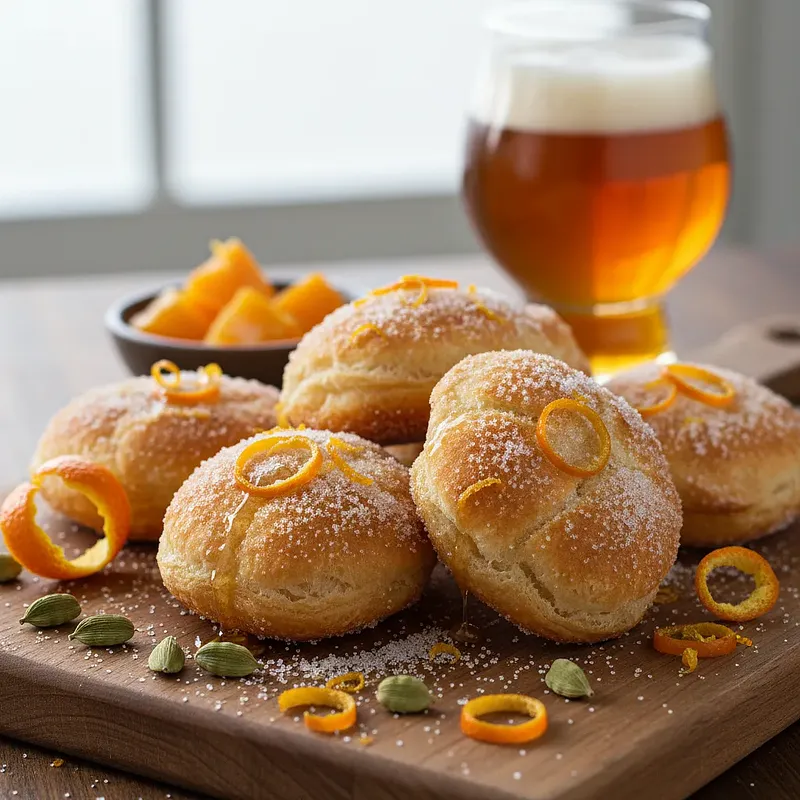 Here is a unique version of traditional Polish angel wings, also known as chrust. This recipe enhances the classic formula with subtle yet distinct aromatic notes. The addition of light beer makes the dough incredibly light and crispy, and during frying, it forms characteristic, crunchy bubbles. The secret to their lightness is also the addition of spirit, which, when evaporating in hot fat, prevents excessive absorption. What sets this version apart is the addition of freshly grated orange zest and a pinch of ground cardamom. These two ingredients create an extraordinary flavor composition – the citrus freshness perfectly complements the spicy, slightly perfumed aroma of cardamom, giving the angel wings a modern and elegant character. Perfect for Fat Thursday, Carnival, or as a gourmet snack with coffee. Served in an appetizing mound, generously dusted with powdered sugar, they are not only a delicious dessert but also a beautiful table decoration.