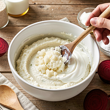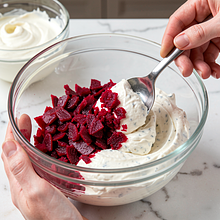A traditional Polish snack combining spicy, peppery horseradish with sweet, earthy beets. Served as a spread or as an accompaniment to cold cuts, Easter eggs, and rye bread. The idea is simple, yet visually striking — the intense red color of the beets with the white and creamy streaks of horseradish creates a beautiful contrast. The flavor is simultaneously spicy, slightly sour, and gently sweet; you can adjust the sharper or milder profile by varying the amount of cream and sugar. The recipe is quick (about 15 min) if you use pre-cooked beets, and alternatives allow for a dairy-free version.