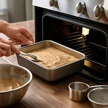 Pour the batter into the prepared pan, smoothing the surface with a spatula. Place in the preheated oven and bake for 40-50 minutes at 175°C. After 35 minutes, start checking with a toothpick: insert a dry toothpick into the center of the cake; if it comes out dry or with a few moist crumbs (but not raw batter), it is ready.