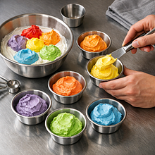 On a plate or serving platter, place the first (bottom) layer of sponge cake. Evenly spread one portion of colorful cream (about 80–90 g) and smooth it out with a spatula, leaving a thin margin around the edges. Place the second layer of sponge cake and repeat with the next color. Continue until the last layer, finishing with the cream of the last shade. After stacking all the layers, spread a thin layer of cream on the sides to "fix" the crumbs (the so-called crumb coat) and chill the cake in the refrigerator for 20–30 minutes. After chilling, apply a second, decorative layer of cream and smooth the sides and top.