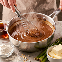 Season the sauce with salt and pepper to taste. If you want a creamy finish, reduce the heat and add 100 g of 18% cream (optional), stirring and cooking for 1–2 minutes — do not boil vigorously to prevent the cream from curdling. Finally, add 10 g of cold butter and stir until combined for a glossy finish.