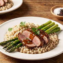 Store meat and sauce separately in airtight containers in the refrigerator for up to 2 days. Keep the groats and asparagus separate. Heat the sauce slowly over low heat, stirring to prevent burning; add a little broth or water if it thickens. Reheat the meat in the oven at 120–130°C for 10–15 minutes to avoid drying it out.