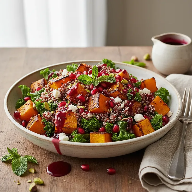 This salad is the essence of autumn on a plate. It combines an extraordinary richness of flavors, textures, and colors, creating a dish that is both hearty and elegant. At the heart of the composition is sweet, velvety butternut squash, roasted with a hint of cinnamon until it achieves a golden skin and tender, melt-in-your-mouth flesh. Its warmth perfectly contrasts with the crunchiness of fresh lamb's lettuce and the slightly nutty flavor of quinoa, known as the 'gold of the Incas.' The dish is completed by salty, bold feta cheese, which balances the sweetness of the squash, and crunchy, toasted pecans. Topping it all off is a ruby-red pomegranate vinaigrette – its sweet and sour taste perfectly ties all the ingredients together. The salad is not only delicious but also incredibly photogenic, making it an ideal choice for lunch, a light dinner, or an impressive appetizer during gatherings with loved ones.