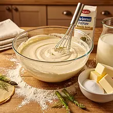 Prepare the batter for the crespelle: sift the flour into a large bowl and make a well in the center. In a separate bowl, beat the eggs with a fork, pour in half of the milk, and gently mix to loosen the eggs. Pour the egg-milk mixture into the flour and whisk, starting from the center, gradually adding the rest of the milk until a smooth, liquid batter without lumps forms. Add 1 g of salt (about a pinch). Finally, pour in 25 g of melted, cooled butter and mix until you achieve a uniform consistency. The batter should have the consistency of thin yogurt and flow freely from a spoon.