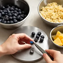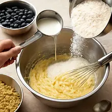 Prepare the blueberries: if they are very large, cut them in half. To prevent the fruits from sinking to the bottom, toss them in about 1-2 tablespoons of flour (use the reserved flour). Then gently fold the blueberries into the batter using a spatula, making upward motions from the bottom to avoid crushing the fruits. The batter should maintain a marbled or slightly speckled texture.
