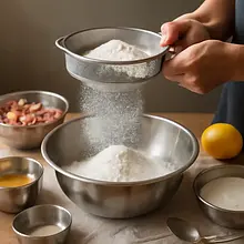 Wash the rhubarb under cold water, trim the ends, and if the skin is very fibrous, lightly peel the outer part. Cut the stalks into pieces about 1 cm long. Place the chopped rhubarb in a large bowl, sprinkle with 50 g of white sugar and 10 g of cornstarch. Gently mix with a wooden spoon so that each piece is lightly coated — set aside for 10–15 minutes until the sugar starts to release juice and the rhubarb is slightly soft but not mushy.