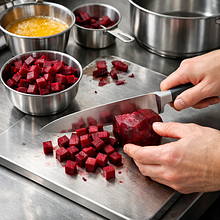 Prepare the sauce ingredients. If you are using raw beetroot: peel and cut into small cubes (about 1 cm). Place the beetroot in a small pot, add 150 ml of water, bring to a boil, reduce the heat, and cook for 18-20 minutes until the beetroot is tender (check with a fork). If you are using pre-cooked beetroot or from a jar, cut it into smaller pieces and move on. Squeeze the juice from 2 oranges (save the peel of one orange for decoration).