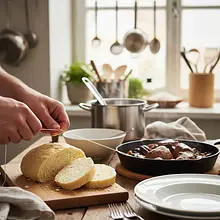 While the meat is roasting, return to the dumplings. Transfer the risen dough to a lightly floured surface. Knead briefly to remove air bubbles. Divide the dough into two equal parts and shape each into a long roll (dumpling) about 20-25 cm long and 5-6 cm in diameter. Place the shaped dumplings on a board, cover with a cloth, and let them rest for another 15-20 minutes to puff up.