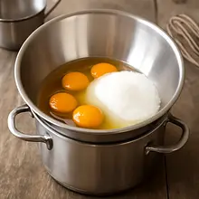 In a large, heatproof bowl, place all 360 g of eggs (whole) and 200 g of sugar. Set the bowl over a pot of gently simmering water (double boiler): the bottom of the bowl should not touch the surface of the water. Whisk continuously for 4–6 minutes until the mixture is pleasantly warm (38–40°C) and the sugar dissolves — check a few crystals by rubbing the mixture between your fingers. The goal is to achieve a warm, but not hot, mixture that whips more easily.