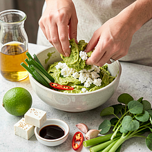 In a bowl with avocado flesh, add crumbled feta cheese, lime juice (cut the lime and squeeze without seeds), sesame oil, soy sauce, and garlic cloves grated on a fine grater or pressed through a garlic press. Add chopped sorrel, the white part of the spring onion, and chopped chili pepper. Mash everything with a potato masher or fork to a creamy but slightly chunky consistency — about 1–2 minutes if mashing by hand; if using a blender, blend briefly (2 x 1 second) to avoid overheating and turning it into soup.